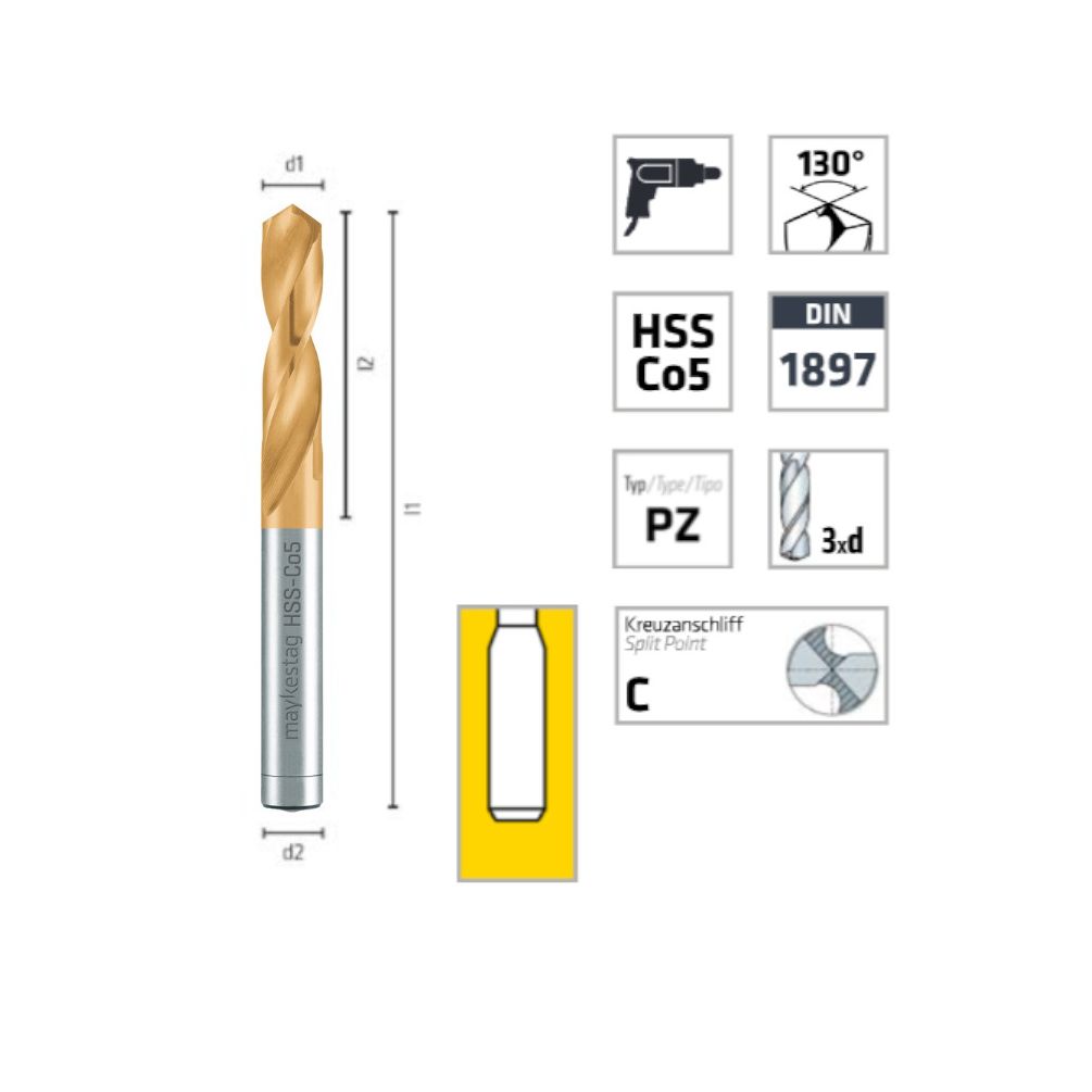 Foret Pour Points De Soudage HSS Cobalt Ø8 Mm - Longueur Totale 44 Mm, Longueur De Perçage 20 Mm - Haute Préci - ALPEN-MAYKESTAG