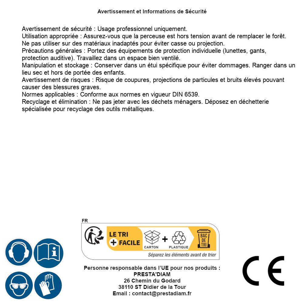 | ADVERTENCIA y SEGURIDAD | Identification de la personne responsable dans l’UE : Nom : PRESTA'DIAM. Adresse : 26 Chemin du Godard, 38110 ST Didier de la Tour (France). Email : contact@prestadiam.fr. |