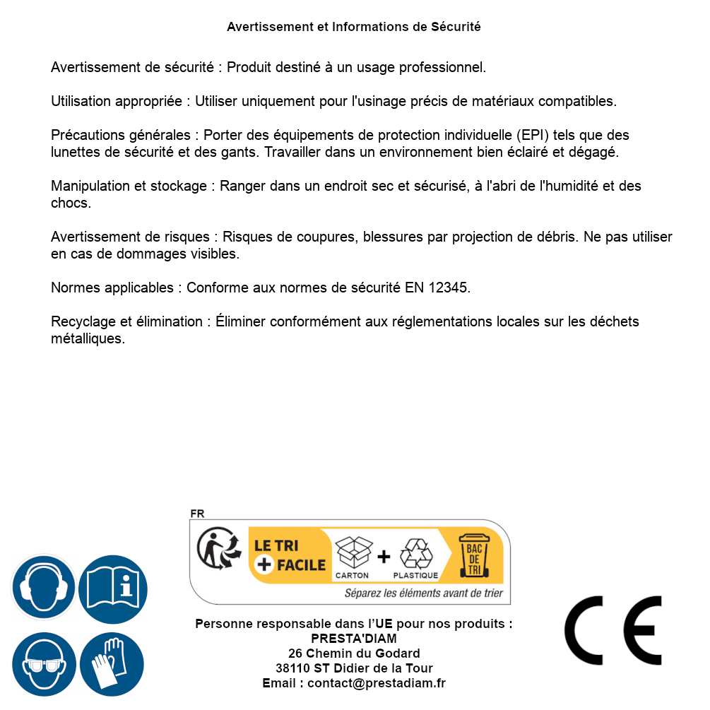 | AVERTISSEMENT et SECURITE | Avertissement de sécurité : Produit destiné à un usage professionnel. Utilisation appropriée : Utiliser uniquement pour l'usinage précis de matériaux compatibles. Précautions générales : Porter des équipements de protection individuelle (EPI) tels que des lunettes de sécurité et des gants. Travailler dans un environnement bien éclairé et dégagé. Manipulation et stockage : Ranger dans un endroit sec et sécurisé, à l'abri de l'humidité et des chocs. Avertissement de risques : Risques de coupures, blessures par projection de débris. Ne pas utiliser en cas de dommages visibles. Normes applicables : Conforme aux normes de sécurité EN 12345. Recyclage et élimination : Éliminer conformément aux réglementations locales sur les déchets métalliques. Identification de la personne responsable dans l’UE : Nom : PRESTA'DIAM. Adresse : 26 Chemin du Godard, 38110 ST Didier de la Tour (France). Email : contact@prestadiam.fr. |