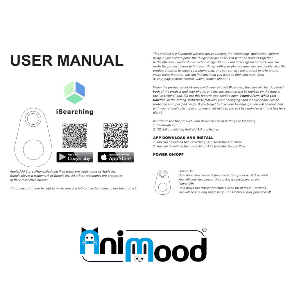 | Manuel d'utilisation | Présentation du produit : Le Traqueur Traceur Localisateur GPS Anti-Perte d'Animood est conçu pour suivre vos animaux de compagnie, clés, bagages ou enfants. Son étanchéité et sa technologie de pointe offrent une tranquillité totale. Caractéristiques principales : - Appareil spécialement conçu pour chiens et chats - Étanchéité pour une protection optimale - Précision de localisation jusqu'à 15 mètres Instructions d'utilisation : 1. Téléchargez l'application iSearching sur l'App Store ou Google Play. 2. Connectez-vous au traqueur en suivant les instructions. 3. Surveillez en temps réel la position de l'appareil et accédez aux fonctionnalités disponibles. Précautions d'utilisation : - Ne pas immerger le dispositif dans l'eau, bien qu'il soit étanche. - Ne pas exposer à des températures extrêmes. Entretien et nettoyage : - Remplacer la pile CR 2032 lorsque nécessaire. - Nettoyer avec un chiffon doux et sec pour maintenir en bon état. |
