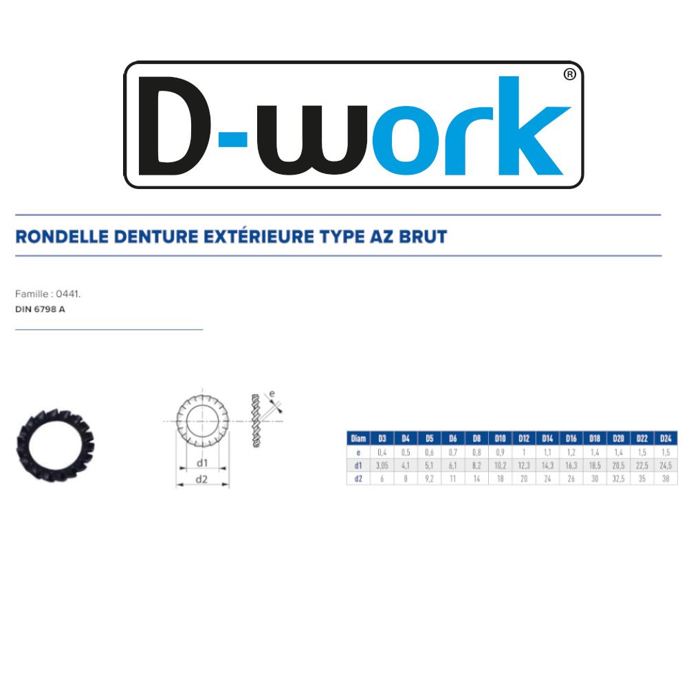 1000 Rondelles Denture Extérieure M6 mm - DIN 6798 A - Brut - D-Work