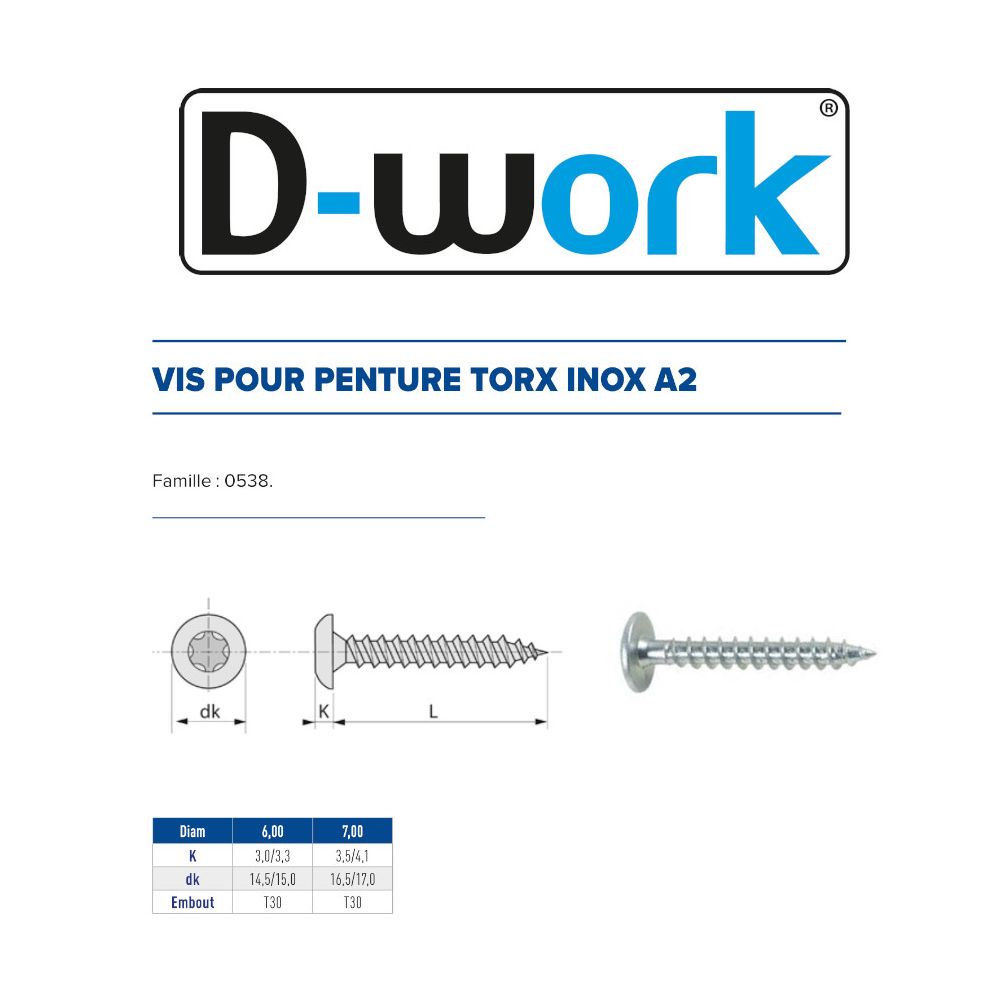 Ref. LEN-0538-7-60En savoir + sur 100 Vis Bois pour Penture Torx TX30 7 x 60 mm - Inox A2 - D-Work