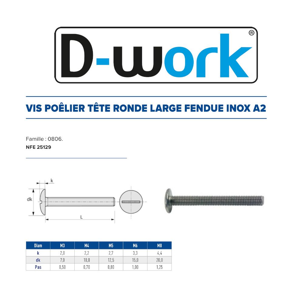 Ref. LEN-0806-8-80En savoir + sur 100 Vis Poêlier Tête Ronde Large Fendue 8 x 80 mm - NFE 25129 - Inox A2 - D-Work