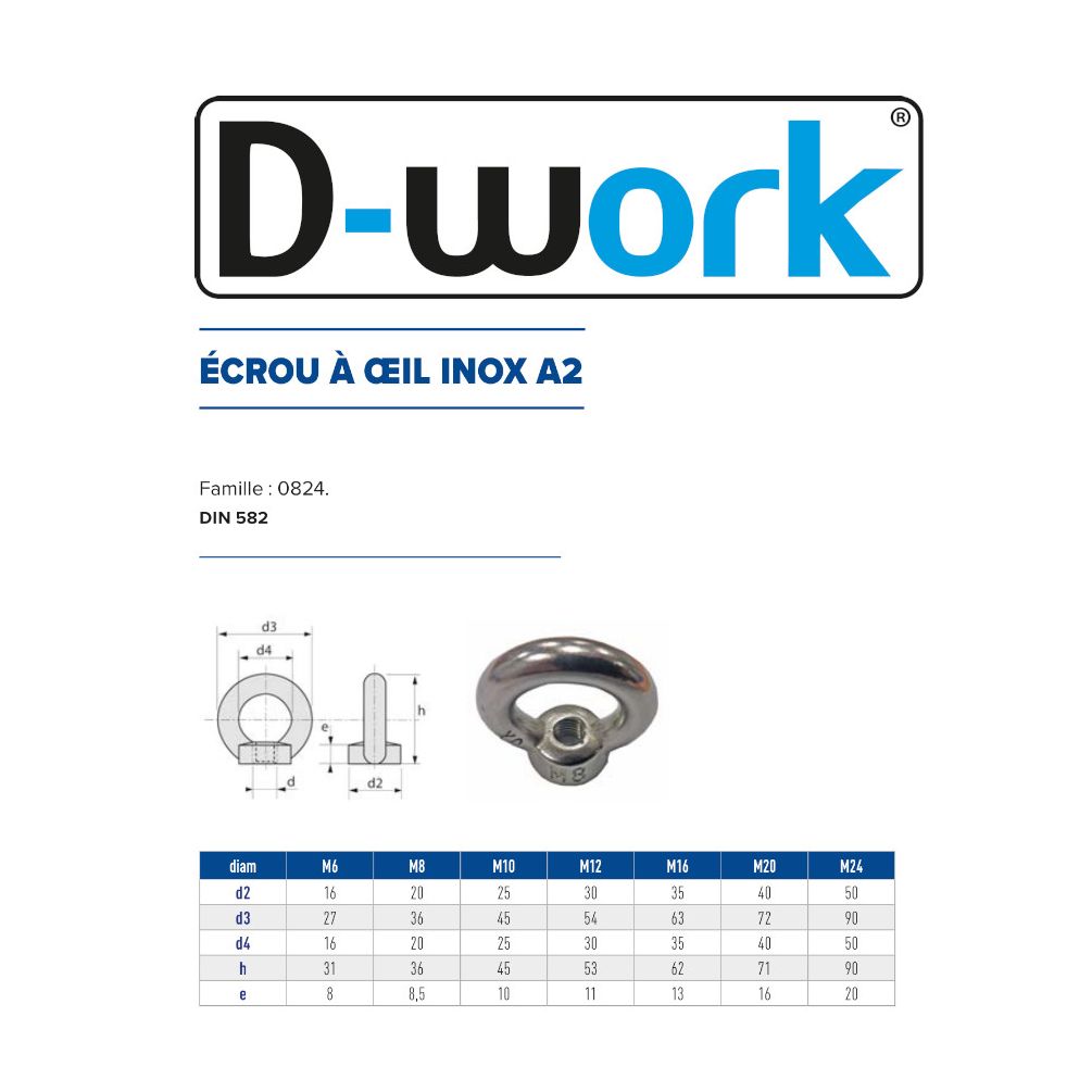 25 Ecrous à Oeil M6 mm - Inox A2 - D-Work