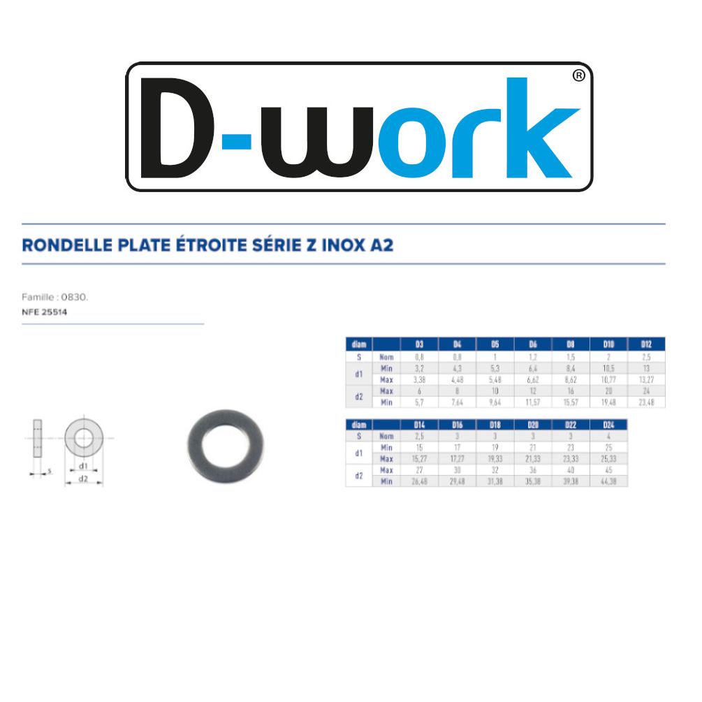 200 Rondelles Plates Etroites M6 mm - NFE 25514 - Inox A2 - D-Work