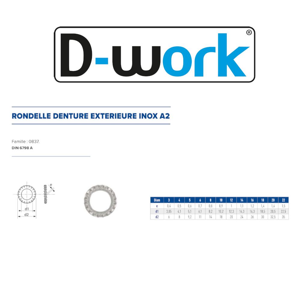 Ref. LEN-0837-12En savoir + sur 100 Rondelles Denture Extérieure M12 mm - DIN 6798 A - Inox A2 - D-Work