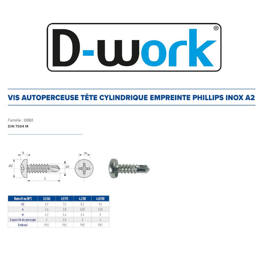 Ref. LEN-0861-3.5-12.7En savoir + sur 200 Vis Autoperceuses Tête Cylindrique Phillips 3.5 x 12.7 mm - DIN 7504 M - Inox A2 - D-Work