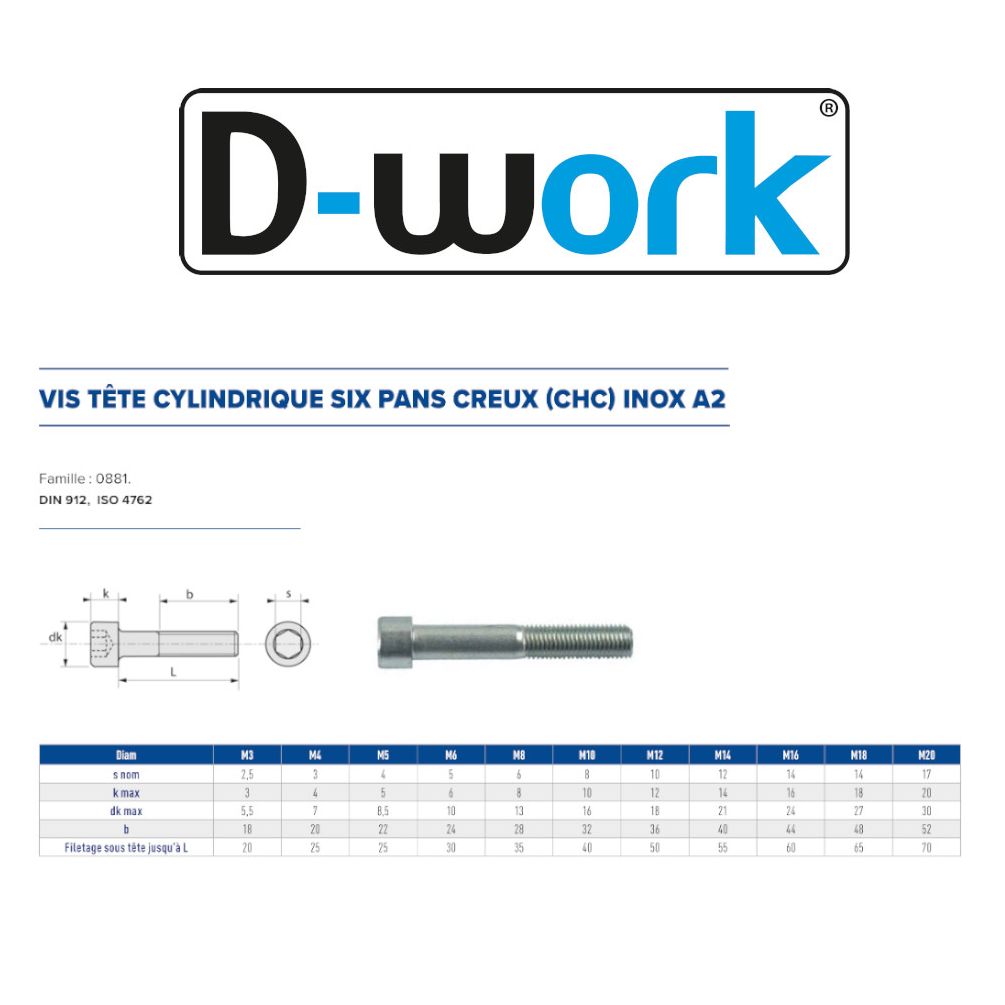Ref. LEN-0881-6-90En savoir + sur 100 Vis Métaux Tête Cylindrique 6 Pans Creux CHC 6 x 90 mm - DIN 912 - Inox A2 - D-Work
