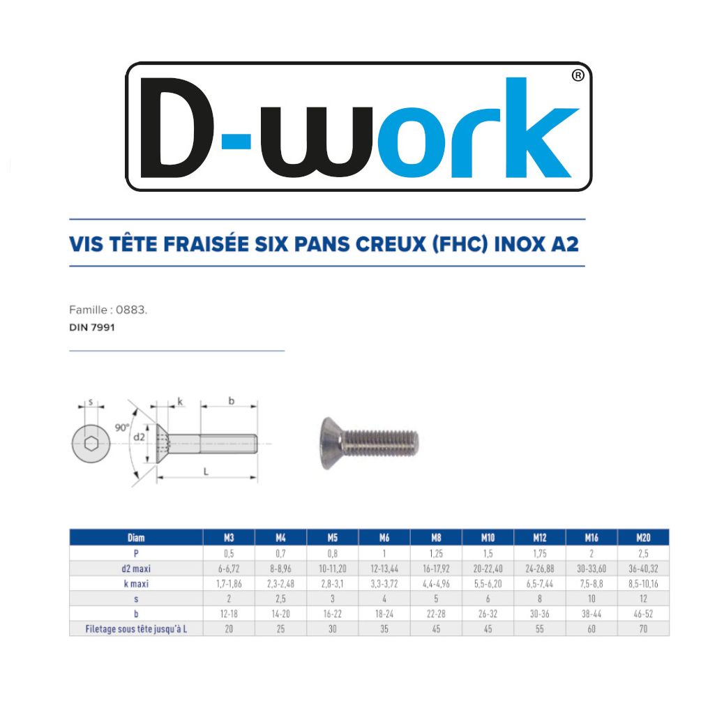Ref. LEN-0883-6-70En savoir + sur 100 Vis Métaux Tête Fraisée 6 Pans Creux FHC 6 x 70 mm - DIN 7991 - Inox A2 - D-Work