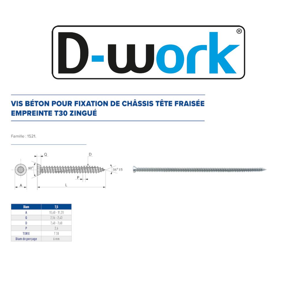 Ref. LEN-1521-7.5-62En savoir + sur 200 Vis Béton d'Ancrage Tête Fraisée Torx T30 7.5 x 62 mm - Zingué blanc - D-Work