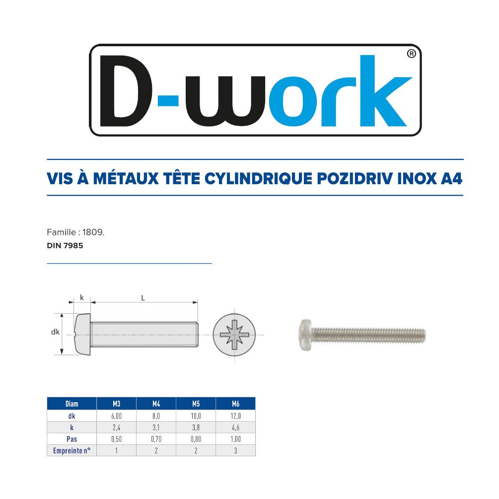 - Type : Vis à Tête Cylindrique Pozidriv