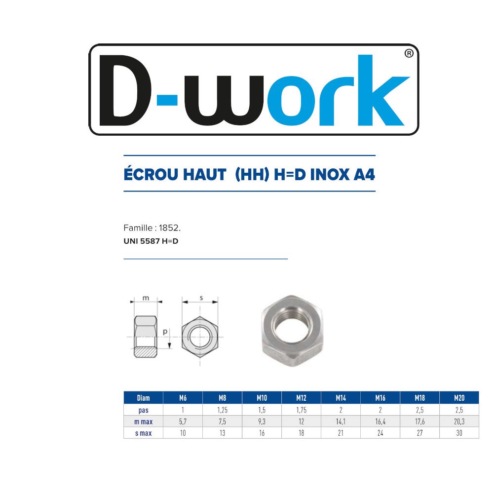 Ref. LEN-1852-10En savoir + sur 500 Ecrous Hexagonaux Haut H Egale D M10 mm - UNI 5587 - Inox A4 - D-Work