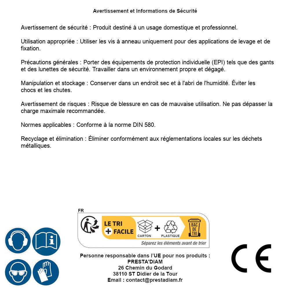 | AVERTISSEMENT et SECURITE | Avertissement de sécurité : Produit destiné à un usage domestique. Utilisation appropriée : Utiliser les vis à anneau uniquement pour des applications de levage et de fixation. Précautions générales : Porter des gants et des lunettes de protection lors de la manipulation. Travailler dans un environnement sec et propre. Manipulation et stockage : Conserver dans un endroit sec, à l'abri de l'humidité. Ne pas exposer à des températures extrêmes. Avertissement de risques : Risque de blessure en cas de chute d'objets. Ne pas dépasser la charge maximale recommandée. Normes applicables : Conforme à la norme DIN 580. Recyclage et élimination : Éliminer conformément aux réglementations locales sur les métaux. Identification de la personne responsable dans l’UE : Nom : PRESTA'DIAM. Adresse : 26 Chemin du Godard, 38110 ST Didier de la Tour (France). Email : contact@prestadiam.fr. |