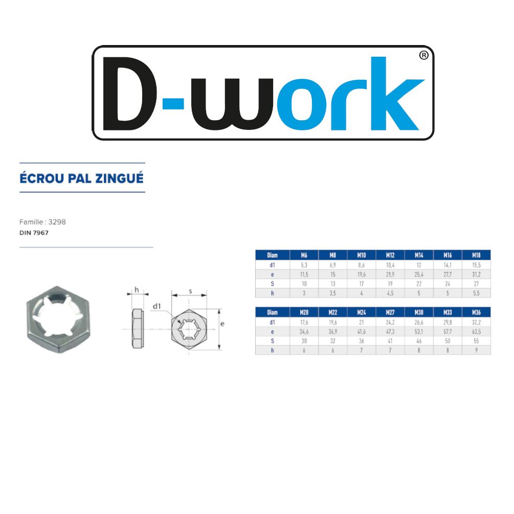 Les écrous pal DIN 7967 M6 zingué blanc sont des éléments de fixation essentiels pour assurer la sécurité et la durabilité de vos assemblages. Conçus pour s'adapter parfaitement aux vis M6, ces écrous sont idéaux pour une utilisation dans divers projets de construction et de bricolage.
