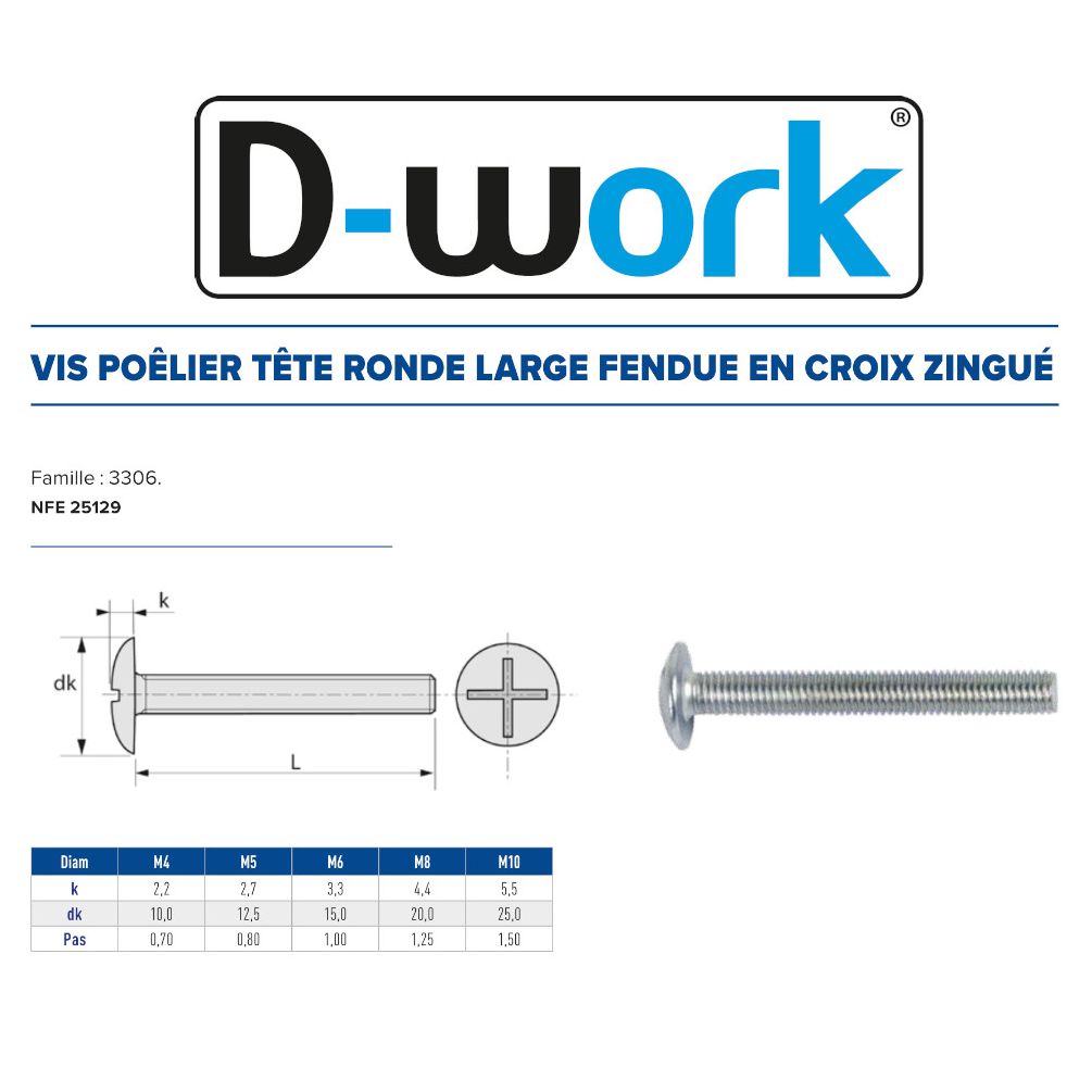 Ref. LEN-3306-6-50En savoir + sur 100 Vis Boulons Poêlier Tête Ronde Large Fendue en Croix 6 x 50 mm - NFE 25129 - Zingué blanc - D-Work
