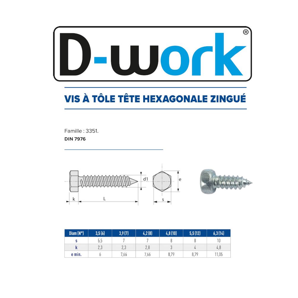 250 Vis à Tôle Tête Hexagonale N12 5.5 x 50.8 mm - DIN 7976 - Zingué blanc - D-Work