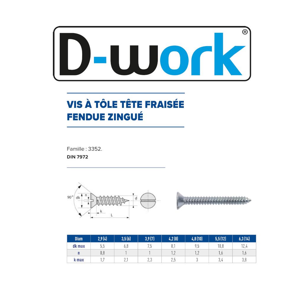 Ref. LEN-3352-6-12.7En savoir + sur 1000 Vis à Tôle Tête Fraisée Fendue 3.5 x 12.7 mm - DIN 7972 - Zingué blanc - D-Work