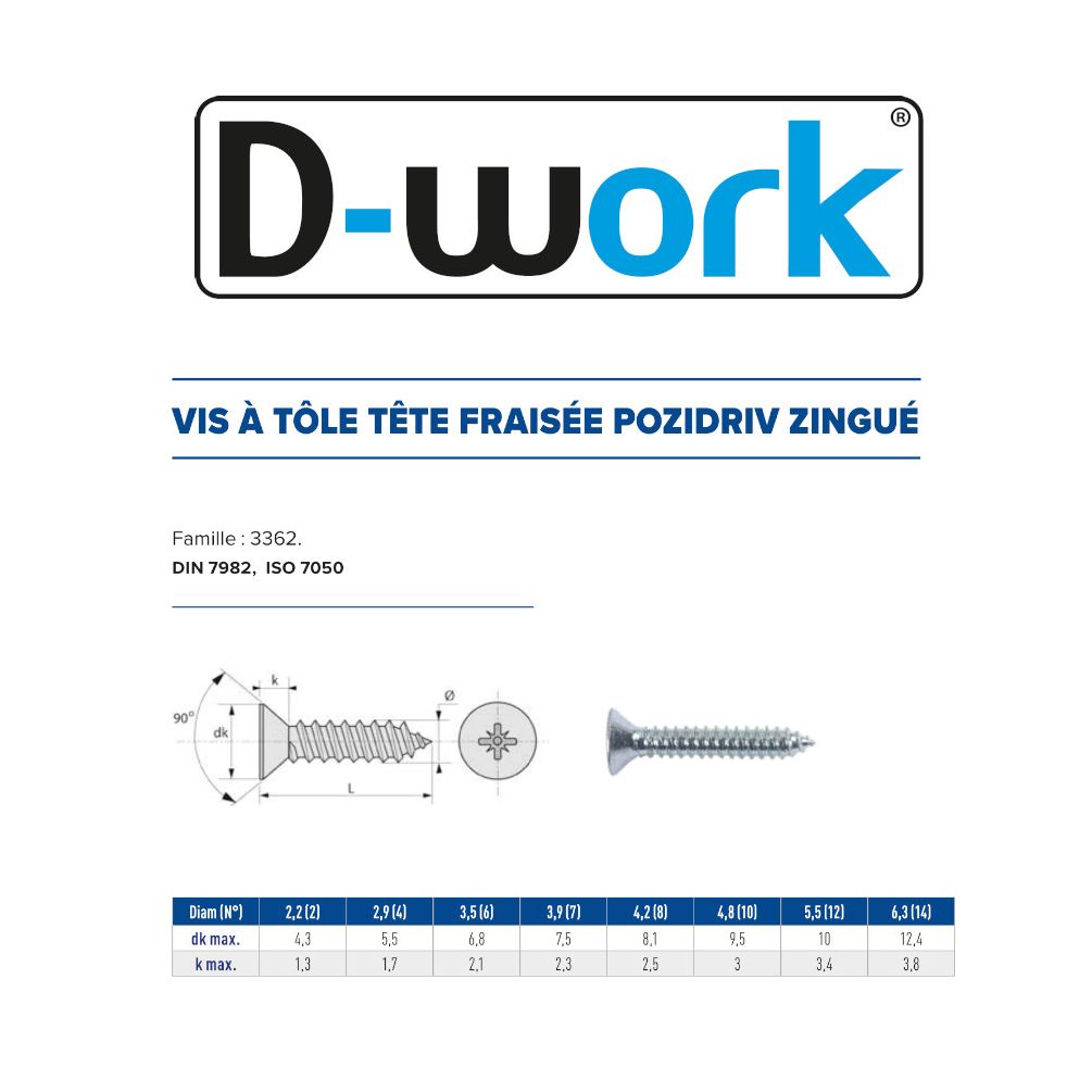 Ref. LEN-3362-8-25.4En savoir + sur 500 Vis à Tôle Tête Fraisée Pozidriv 4.2 x 25.4 mm - DIN 7982 - Zingué blanc - D-Work