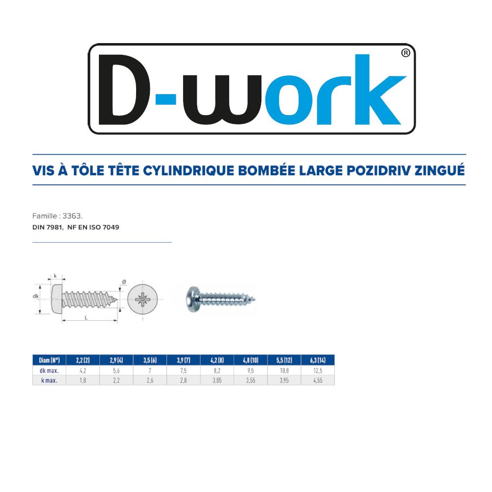 500 Vis à Tôle Tête Cylindrique Larges Pozidriv 4.2 x 38 mm - DIN 7981 - Zingué blanc - D-Work