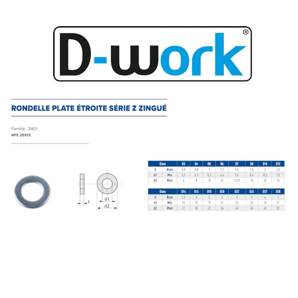 100 Rondelles Plates Etroites M18 mm - NFE 25513 - Zingué blanc - D-Work