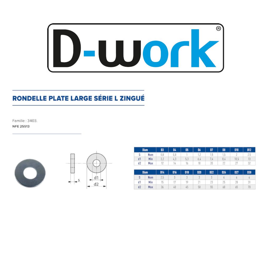 200 Rondelles Plates Larges M12 mm - NFE 25513 - Zingué blanc - D-Work