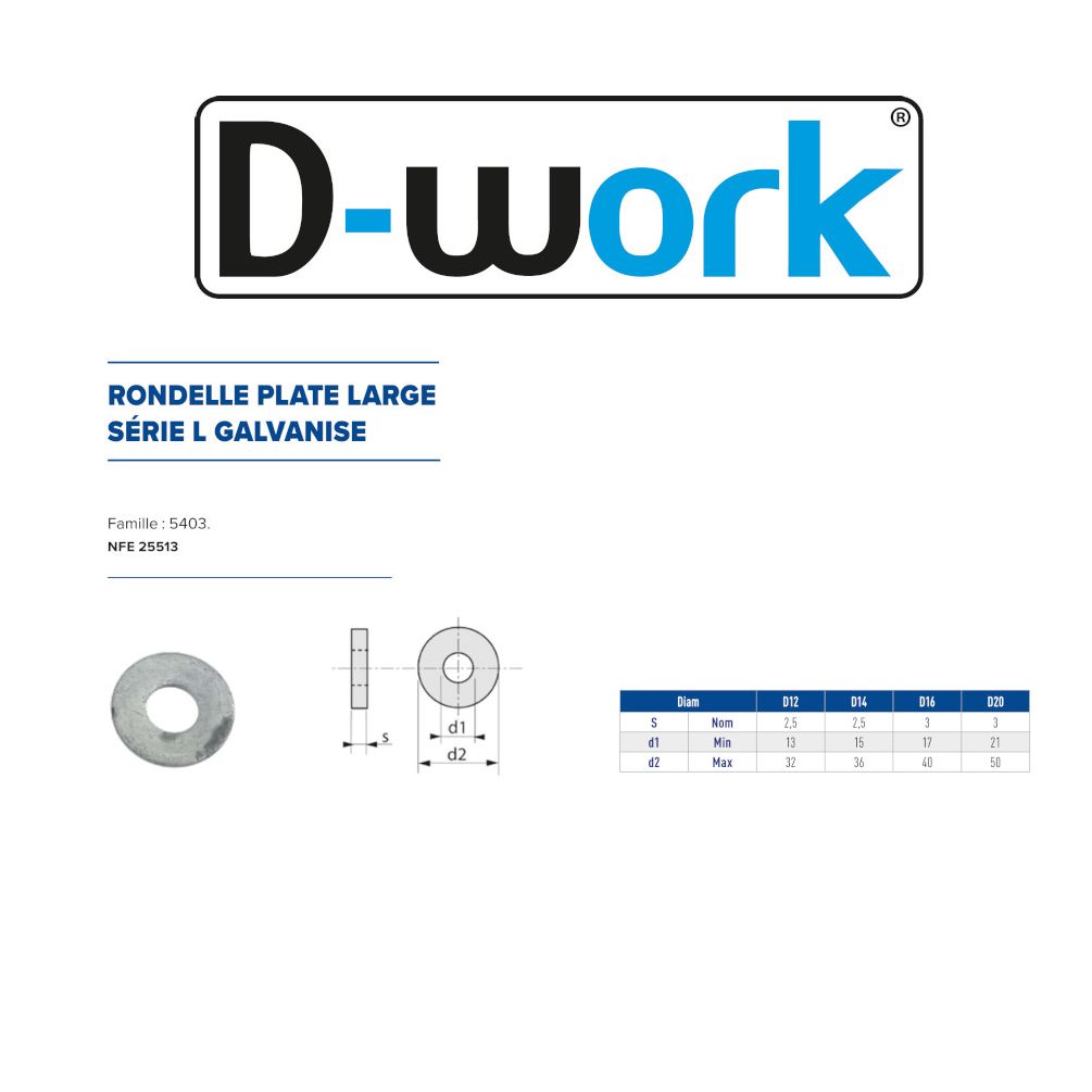 Ref. LEN-5403-12En savoir + sur 200 Rondelles Plates Larges M12 mm - NFE 25513 - Galvanisé - D-Work