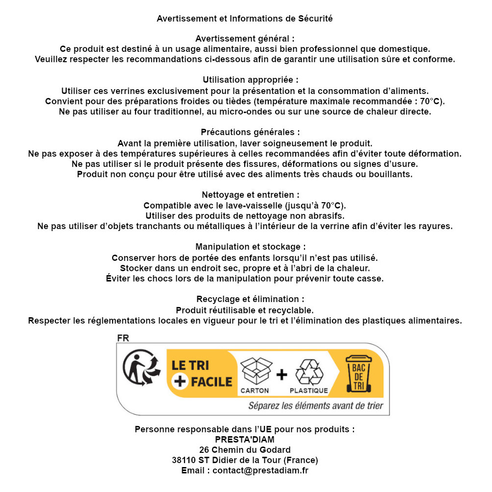 Fabriquées avec soin en France, ces verrines se distinguent par leur qualité supérieure et leur conception entièrement française, garantissant ainsi une résistance optimale et une durabilité remarquable. Réutilisables et recyclables, elles offrent une solution écologique tout en assurant une praticité inégalée.