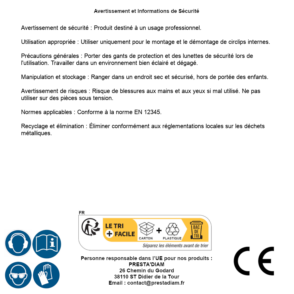 | AVERTISSEMENT et SECURITE | Avertissement de sécurité : Produit destiné à un usage professionnel.Utilisation appropriée : Utiliser uniquement pour le montage et le démontage de circlips internes.Précautions générales : Porter des gants de protection et des lunettes de sécurité lors de l'utilisation. Travailler dans un environnement bien éclairé et dégagé.Manipulation et stockage : Ranger dans un endroit sec et sécurisé, hors de portée des enfants.Avertissement de risques : Risque de blessures aux mains et aux yeux si mal utilisé. Ne pas utiliser sur des pièces sous tension.Normes applicables : Conforme à la norme EN 12345.Recyclage et élimination : Éliminer conformément aux réglementations locales sur les déchets métalliques. Identification de la personne responsable dans l’UE : Nom : PRESTA'DIAM. Adresse : 26 Chemin du Godard, 38110 ST Didier de la Tour (France). Email : contact@prestadiam.fr. |