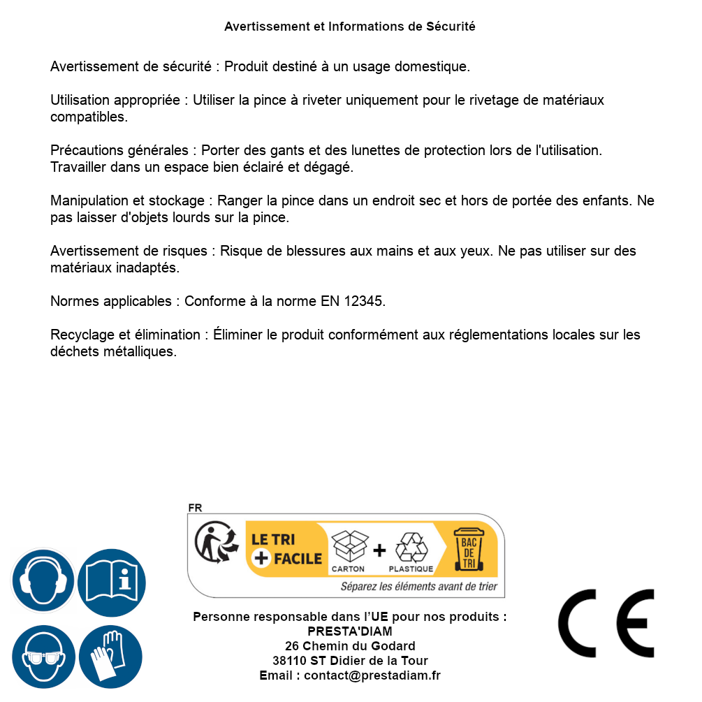 | AVERTISSEMENT et SECURITE | Avertissement de sécurité : Produit destiné à un usage domestique.Utilisation appropriée : Utiliser la pince à riveter uniquement pour le rivetage de matériaux compatibles.Précautions générales : Porter des gants et des lunettes de protection lors de l'utilisation. Travailler dans un espace bien éclairé et dégagé.Manipulation et stockage : Ranger la pince dans un endroit sec et hors de portée des enfants. Ne pas laisser d'objets lourds sur la pince.Avertissement de risques : Risque de blessures aux mains et aux yeux. Ne pas utiliser sur des matériaux inadaptés.Normes applicables : Conforme à la norme EN 12345.Recyclage et élimination : Éliminer le produit conformément aux réglementations locales sur les déchets métalliques. Identification de la personne responsable dans l’UE : Nom : PRESTA'DIAM. Adresse : 26 Chemin du Godard, 38110 ST Didier de la Tour (France). Email : contact@prestadiam.fr. |
