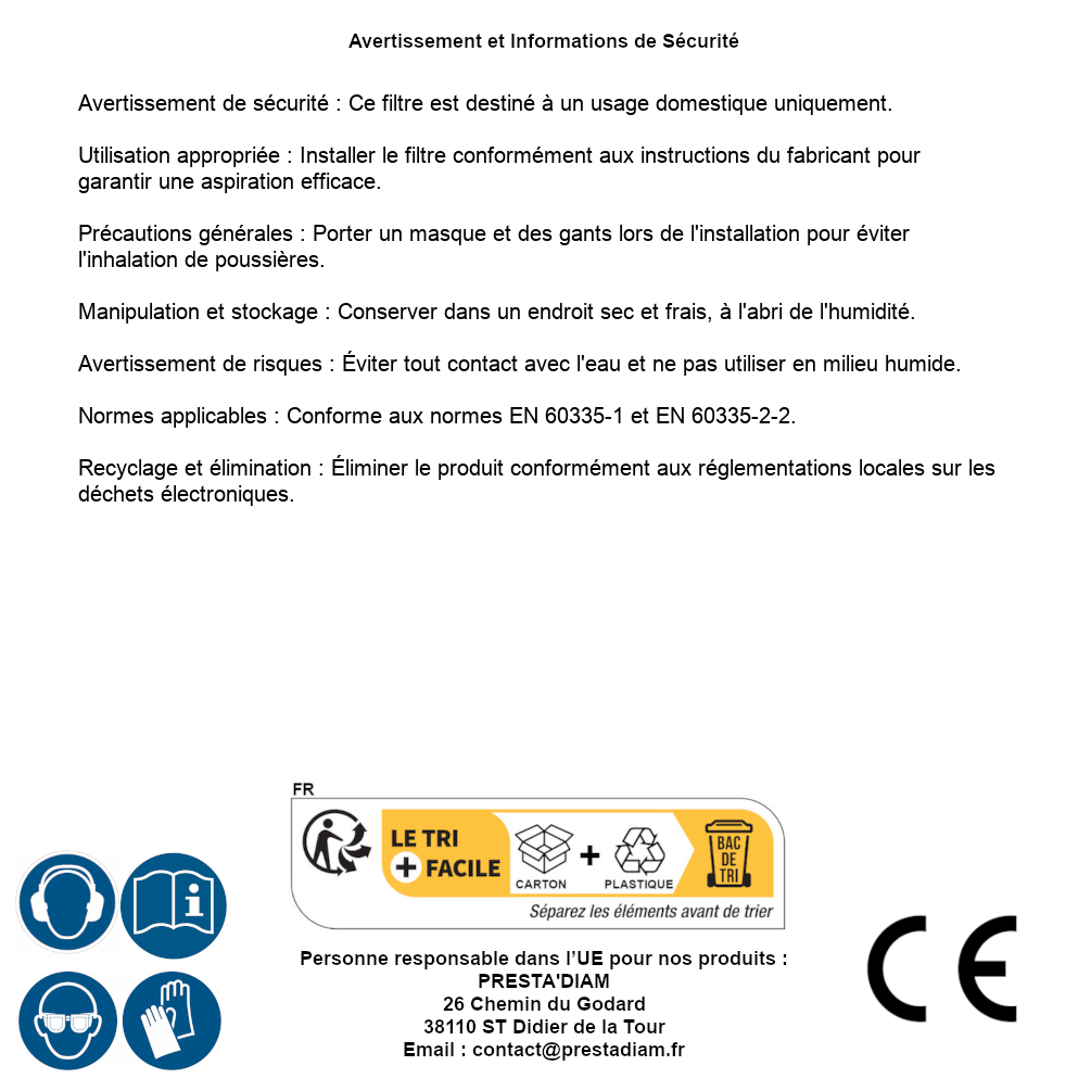 | AVERTISSEMENT et SECURITE | Avertissement de sécurité : Ce filtre est destiné à un usage domestique uniquement.Utilisation appropriée : Installer le filtre conformément aux instructions du fabricant pour garantir une aspiration efficace.Précautions générales : Porter un masque et des gants lors de l'installation pour éviter l'inhalation de poussières.Manipulation et stockage : Conserver dans un endroit sec et frais, à l'abri de l'humidité.Avertissement de risques : Éviter tout contact avec l'eau et ne pas utiliser en milieu humide.Normes applicables : Conforme aux normes EN 60335-1 et EN 60335-2-2.Recyclage et élimination : Éliminer le produit conformément aux réglementations locales sur les déchets électroniques. Identification de la personne responsable dans l’UE : Nom : PRESTA'DIAM. Adresse : 26 Chemin du Godard, 38110 ST Didier de la Tour (France). Email : contact@prestadiam.fr. |