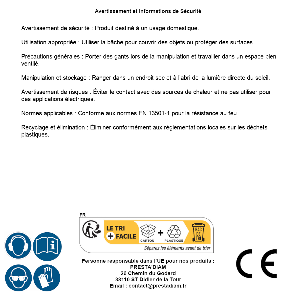 | AVERTISSEMENT et SECURITE | Avertissement de sécurité : Produit destiné à un usage domestique.Utilisation appropriée : Utiliser la bâche pour couvrir des objets ou protéger des surfaces.Précautions générales : Porter des gants lors de la manipulation et travailler dans un espace bien ventilé.Manipulation et stockage : Ranger dans un endroit sec et à l'abri de la lumière directe du soleil.Avertissement de risques : Éviter le contact avec des sources de chaleur et ne pas utiliser pour des applications électriques.Normes applicables : Conforme aux normes EN 13501-1 pour la résistance au feu.Recyclage et élimination : Éliminer conformément aux réglementations locales sur les déchets plastiques. Identification de la personne responsable dans l’UE : Nom : PRESTA'DIAM. Adresse : 26 Chemin du Godard, 38110 ST Didier de la Tour (France). Email : contact@prestadiam.fr. |