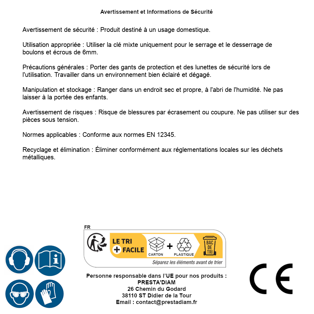 | AVERTISSEMENT et SECURITE | Avertissement de sécurité : Produit destiné à un usage domestique.Utilisation appropriée : Utiliser la clé mixte uniquement pour le serrage et le desserrage de boulons et écrous de 6mm.Précautions générales : Porter des gants de protection et des lunettes de sécurité lors de l'utilisation. Travailler dans un environnement bien éclairé et dégagé.Manipulation et stockage : Ranger dans un endroit sec et propre, à l'abri de l'humidité. Ne pas laisser à la portée des enfants.Avertissement de risques : Risque de blessures par écrasement ou coupure. Ne pas utiliser sur des pièces sous tension.Normes applicables : Conforme aux normes EN 12345.Recyclage et élimination : Éliminer conformément aux réglementations locales sur les déchets métalliques. Identification de la personne responsable dans l’UE : Nom : PRESTA'DIAM. Adresse : 26 Chemin du Godard, 38110 ST Didier de la Tour (France). Email : contact@prestadiam.fr. |