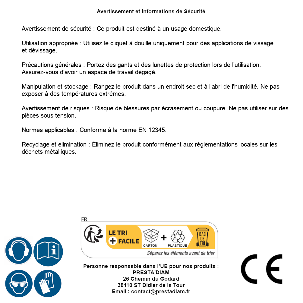 | AVERTISSEMENT et SECURITE | Avertissement de sécurité : Ce produit est destiné à un usage domestique.Utilisation appropriée : Utilisez le cliquet à douille uniquement pour des applications de vissage et dévissage.Précautions générales : Portez des gants et des lunettes de protection lors de l'utilisation. Assurez-vous d'avoir un espace de travail dégagé.Manipulation et stockage : Rangez le produit dans un endroit sec et à l'abri de l'humidité. Ne pas exposer à des températures extrêmes.Avertissement de risques : Risque de blessures par écrasement ou coupure. Ne pas utiliser sur des pièces sous tension.Normes applicables : Conforme à la norme EN 12345.Recyclage et élimination : Éliminez le produit conformément aux réglementations locales sur les déchets métalliques. Identification de la personne responsable dans l’UE : Nom : PRESTA'DIAM. Adresse : 26 Chemin du Godard, 38110 ST Didier de la Tour (France). Email : contact@prestadiam.fr. |