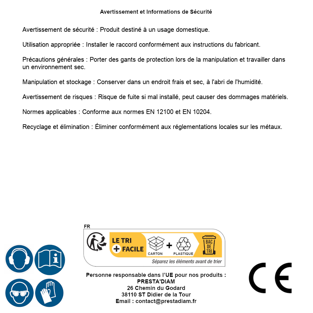 | AVERTISSEMENT et SECURITE | Avertissement de sécurité : Produit destiné à un usage domestique.Utilisation appropriée : Installer le raccord conformément aux instructions du fabricant.Précautions générales : Porter des gants de protection lors de la manipulation et travailler dans un environnement sec.Manipulation et stockage : Conserver dans un endroit frais et sec, à l'abri de l'humidité.Avertissement de risques : Risque de fuite si mal installé, peut causer des dommages matériels.Normes applicables : Conforme aux normes EN 12100 et EN 10204.Recyclage et élimination : Éliminer conformément aux réglementations locales sur les métaux. Identification de la personne responsable dans l’UE : Nom : PRESTA'DIAM. Adresse : 26 Chemin du Godard, 38110 ST Didier de la Tour (France). Email : contact@prestadiam.fr. |