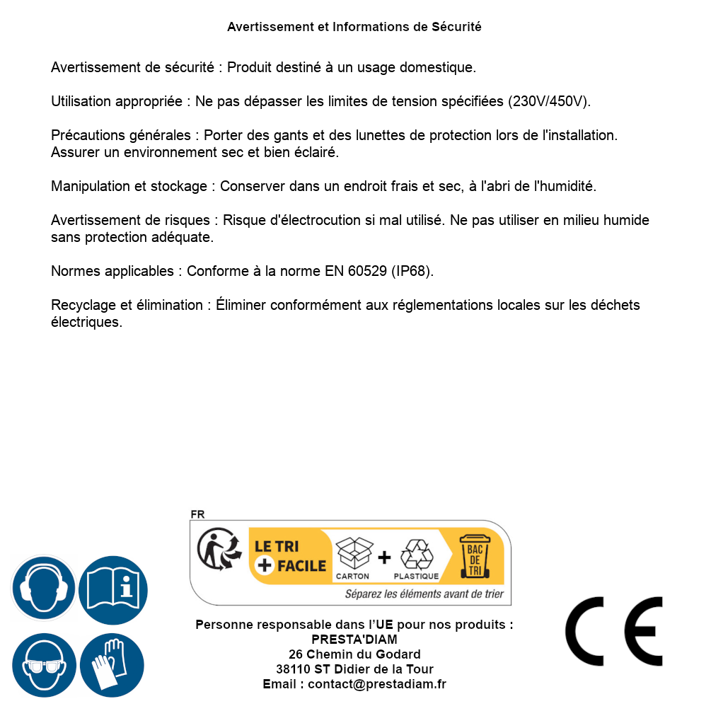 | AVERTISSEMENT et SECURITE | Avertissement de sécurité : Produit destiné à un usage domestique.Utilisation appropriée : Ne pas dépasser les limites de tension spécifiées (230V/450V).Précautions générales : Porter des gants et des lunettes de protection lors de l'installation. Assurer un environnement sec et bien éclairé.Manipulation et stockage : Conserver dans un endroit frais et sec, à l'abri de l'humidité.Avertissement de risques : Risque d'électrocution si mal utilisé. Ne pas utiliser en milieu humide sans protection adéquate.Normes applicables : Conforme à la norme EN 60529 (IP68).Recyclage et élimination : Éliminer conformément aux réglementations locales sur les déchets électriques. Identification de la personne responsable dans l’UE : Nom : PRESTA'DIAM. Adresse : 26 Chemin du Godard, 38110 ST Didier de la Tour (France). Email : contact@prestadiam.fr. |