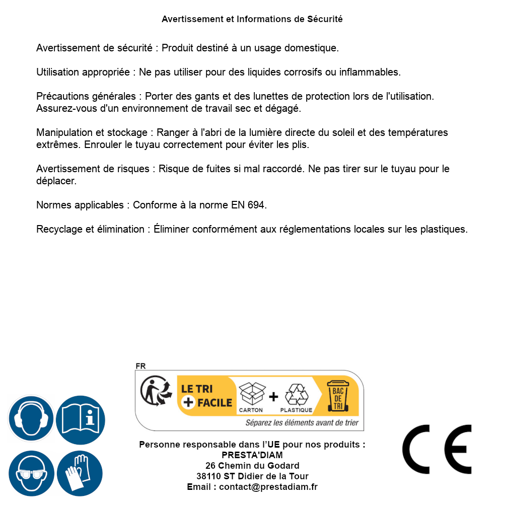 | AVERTISSEMENT et SECURITE | Avertissement de sécurité : Produit destiné à un usage domestique.Utilisation appropriée : Ne pas utiliser pour des liquides corrosifs ou inflammables.Précautions générales : Porter des gants et des lunettes de protection lors de l'utilisation. Assurez-vous d'un environnement de travail sec et dégagé.Manipulation et stockage : Ranger à l'abri de la lumière directe du soleil et des températures extrêmes. Enrouler le tuyau correctement pour éviter les plis.Avertissement de risques : Risque de fuites si mal raccordé. Ne pas tirer sur le tuyau pour le déplacer.Normes applicables : Conforme à la norme EN 694.Recyclage et élimination : Éliminer conformément aux réglementations locales sur les plastiques. Identification de la personne responsable dans l’UE : Nom : PRESTA'DIAM. Adresse : 26 Chemin du Godard, 38110 ST Didier de la Tour (France). Email : contact@prestadiam.fr. |