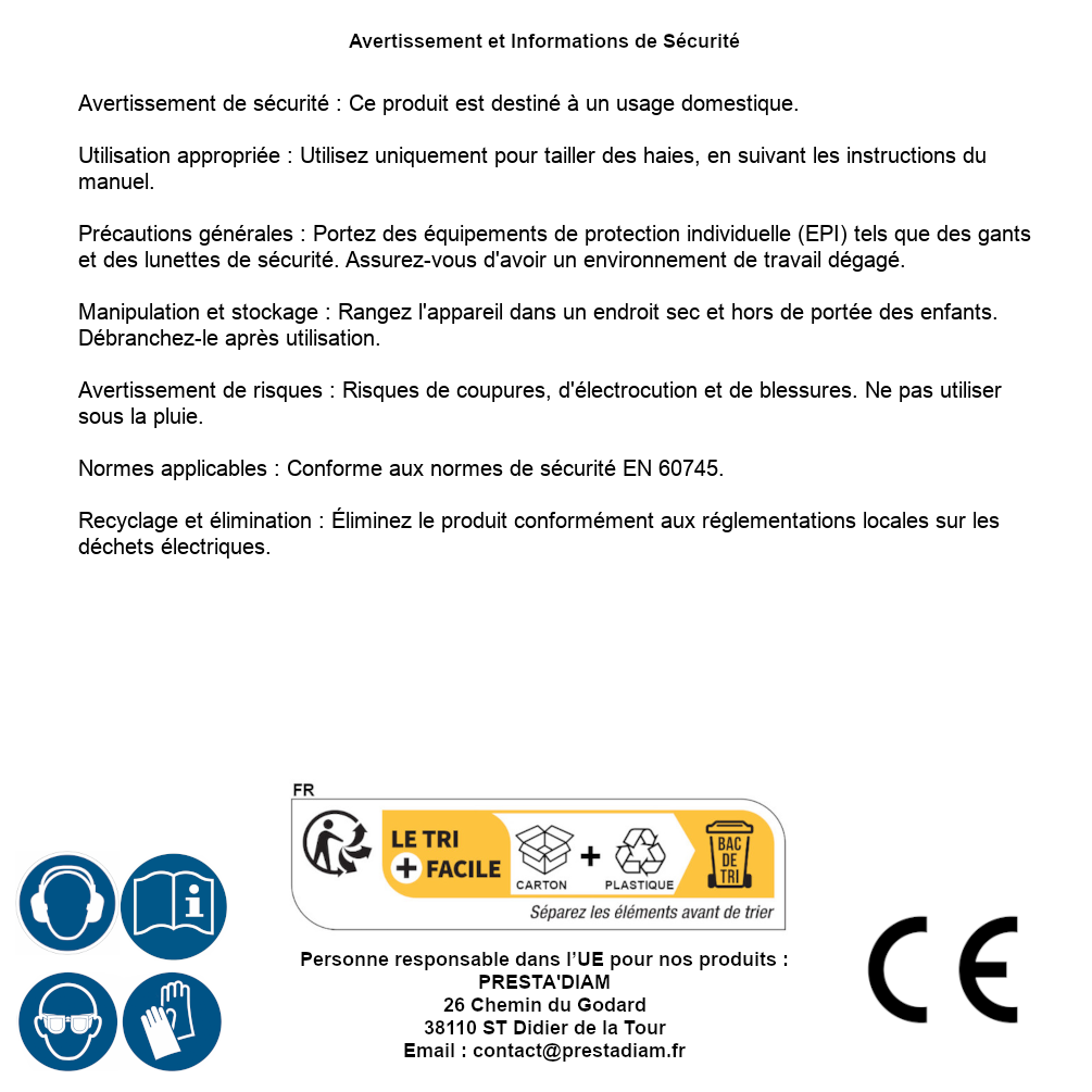 | AVERTISSEMENT et SECURITE | Avertissement de sécurité : Ce produit est destiné à un usage domestique.Utilisation appropriée : Utilisez uniquement pour tailler des haies, en suivant les instructions du manuel.Précautions générales : Portez des équipements de protection individuelle (EPI) tels que des gants et des lunettes de sécurité. Assurez-vous d'avoir un environnement de travail dégagé.Manipulation et stockage : Rangez l'appareil dans un endroit sec et hors de portée des enfants. Débranchez-le après utilisation.Avertissement de risques : Risques de coupures, d'électrocution et de blessures. Ne pas utiliser sous la pluie.Normes applicables : Conforme aux normes de sécurité EN 60745.Recyclage et élimination : Éliminez le produit conformément aux réglementations locales sur les déchets électriques. Identification de la personne responsable dans l’UE : Nom : PRESTA'DIAM. Adresse : 26 Chemin du Godard, 38110 ST Didier de la Tour (France). Email : contact@prestadiam.fr. |
