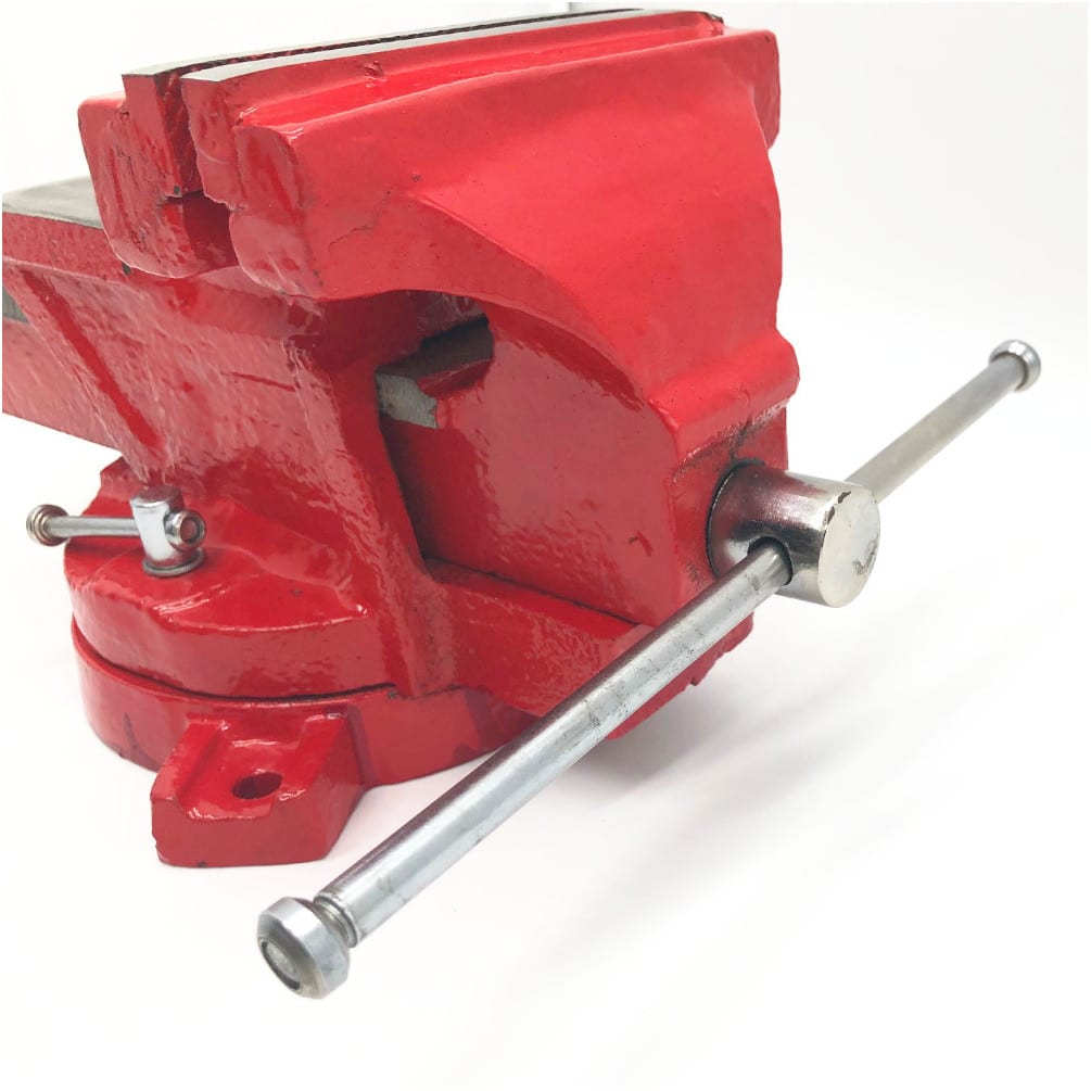 Etau d'ingénieur en fonte à base pivotante mors parallèle 130 mm. Mâchoires en acier trempé interchangeables par vis. Fonte résistante à la distorsion sous forte pression. Poignée et vis-mère chromées.