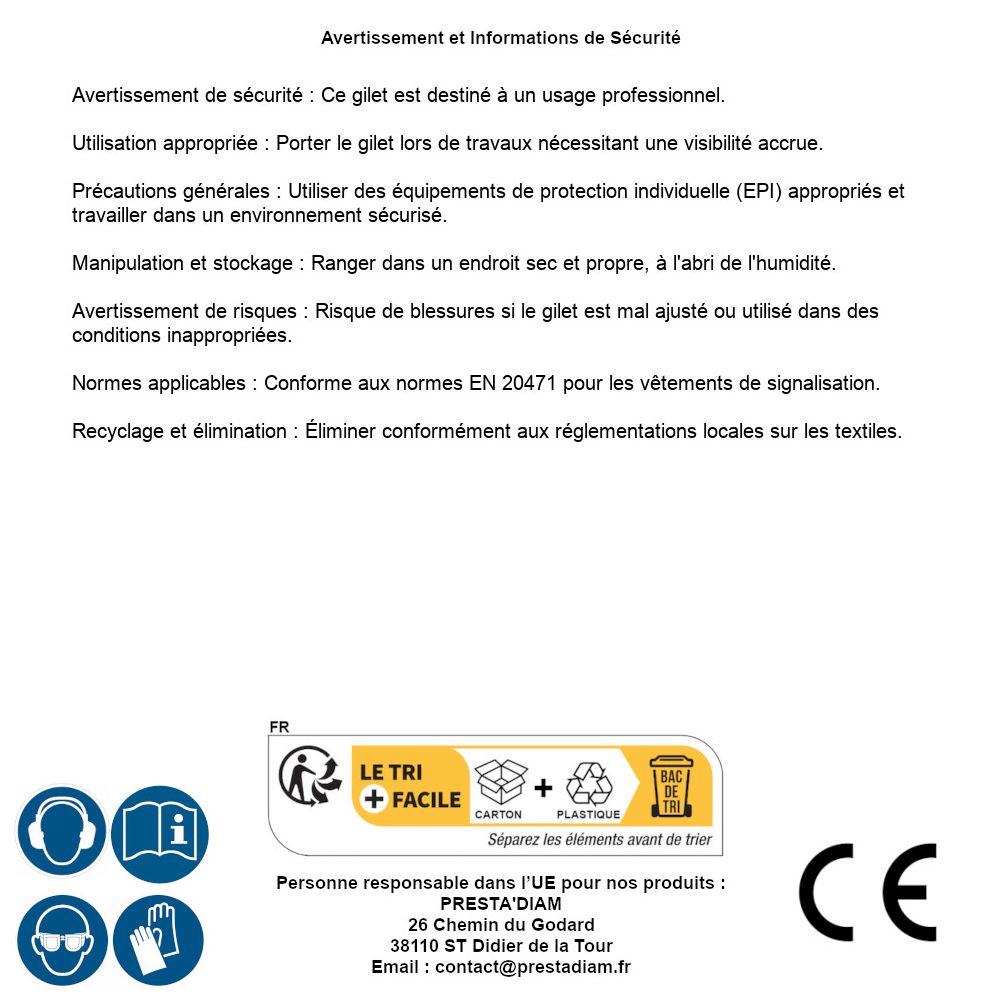 | AVERTISSEMENT et SECURITE | Avertissement de sécurité : Ce gilet est destiné à un usage professionnel. Utilisation appropriée : Porter le gilet lors de travaux nécessitant une visibilité accrue. Précautions générales : Porter des équipements de protection individuelle (EPI) appropriés et travailler dans un environnement sécurisé. Manipulation et stockage : Ranger le gilet dans un endroit sec et propre, à l'abri de l'humidité. Avertissement de risques : Risque de blessures en cas de non-respect des consignes de sécurité. Normes applicables : Conforme aux normes EN 20471 pour les vêtements de signalisation. Recyclage et élimination : Éliminer conformément aux réglementations locales sur les textiles. Identification de la personne responsable dans l’UE : Nom : PRESTA'DIAM. Adresse : 26 Chemin du Godard, 38110 ST Didier de la Tour (France). Email : contact@prestadiam.fr. |