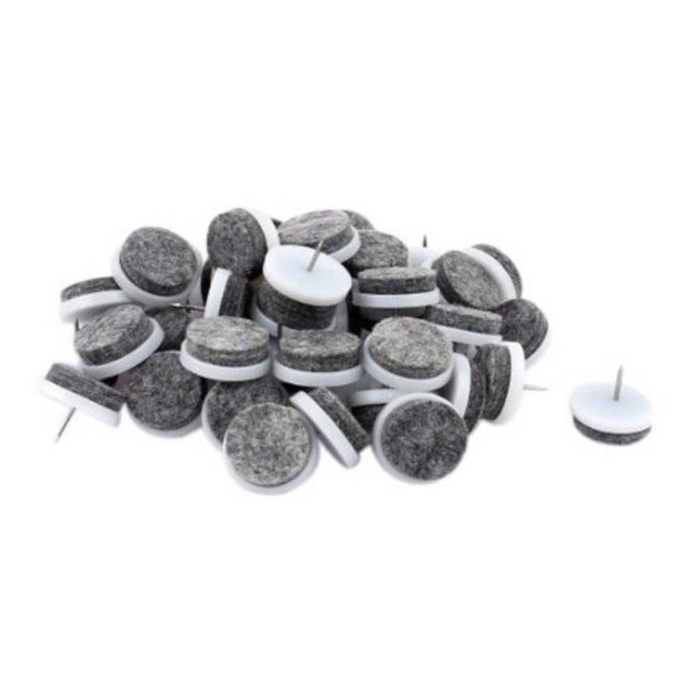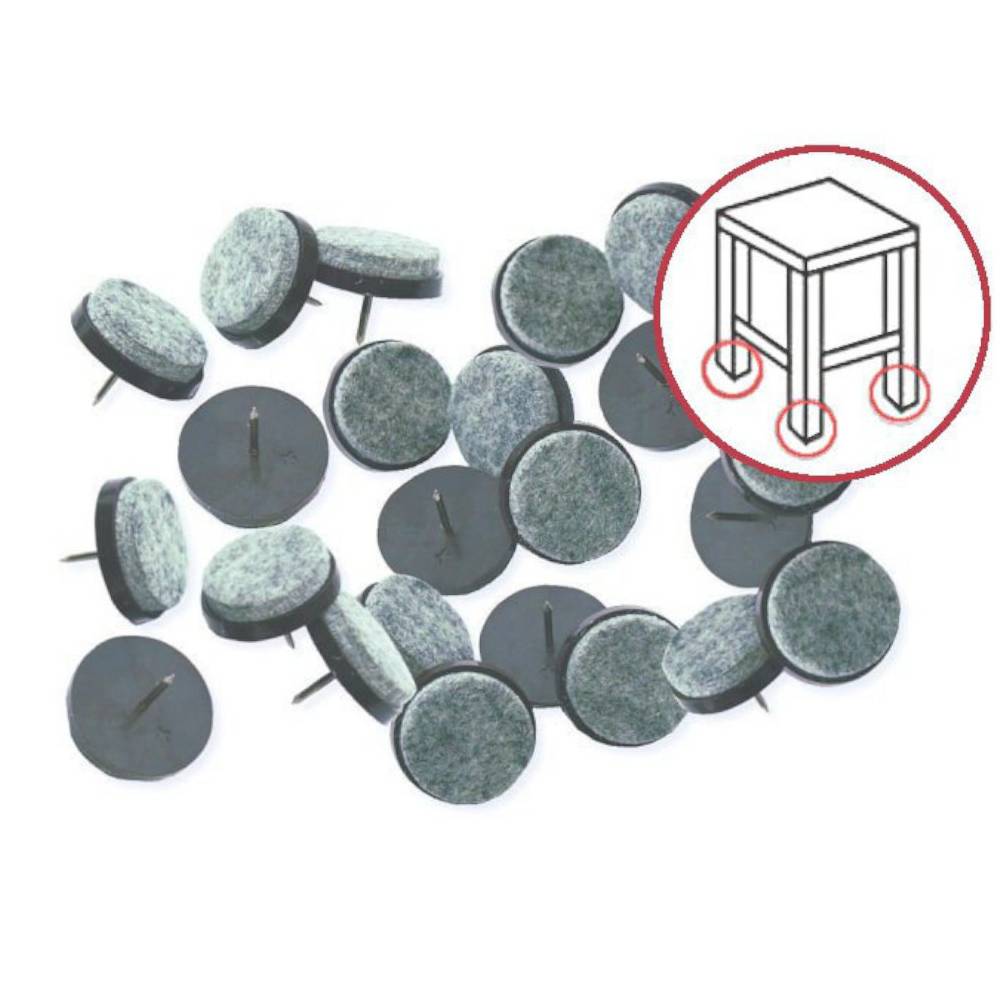 Assortiment de 24 patins en feutre à clouer pour mobiliers, chaises. Ces patins éviteront des bruits sur le sol ou tout simplement de l'endommager. Dimensions : D. 24 x L. 22 mm. Longueur de la pointe : 14 mm. Couleur : Gris (feutre). Nos coloris, emballages produits peuvent variés en fonction de nos arrivages.