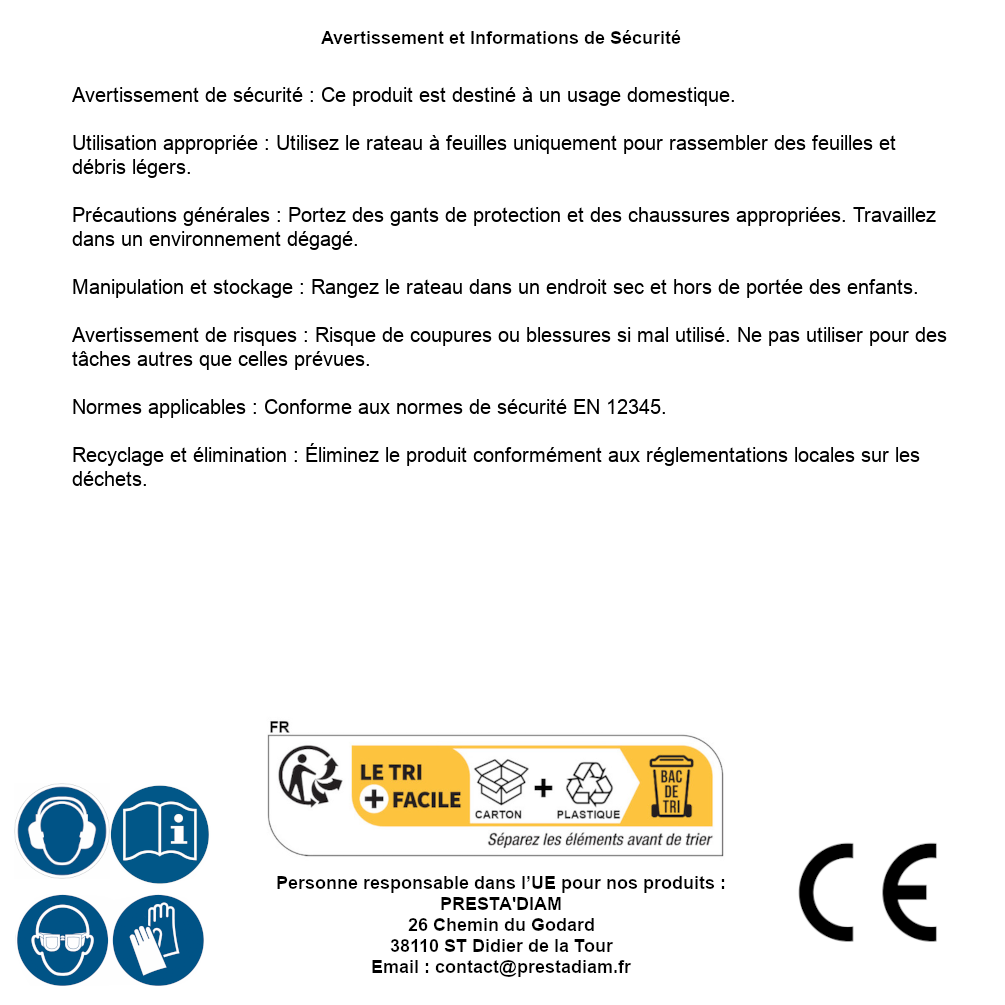 | AVERTISSEMENT et SECURITE | Avertissement de sécurité : Ce produit est destiné à un usage domestique.Utilisation appropriée : Utilisez le rateau à feuilles uniquement pour rassembler des feuilles et débris légers.Précautions générales : Portez des gants de protection et des chaussures appropriées. Travaillez dans un environnement dégagé.Manipulation et stockage : Rangez le rateau dans un endroit sec et hors de portée des enfants.Avertissement de risques : Risque de coupures ou blessures si mal utilisé. Ne pas utiliser pour des tâches autres que celles prévues.Normes applicables : Conforme aux normes de sécurité EN 12345.Recyclage et élimination : Éliminez le produit conformément aux réglementations locales sur les déchets. Identification de la personne responsable dans l’UE : Nom : PRESTA'DIAM. Adresse : 26 Chemin du Godard, 38110 ST Didier de la Tour (France). Email : contact@prestadiam.fr. |