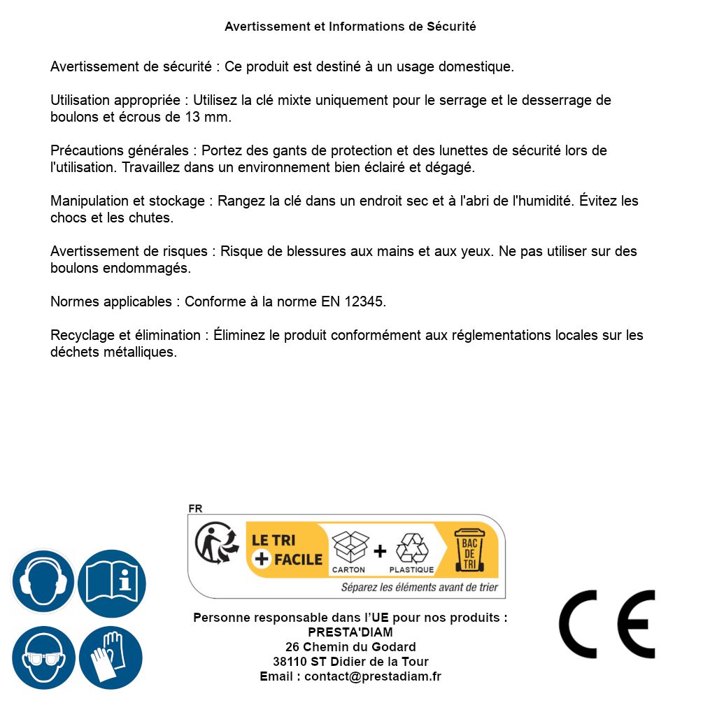 | AVERTISSEMENT et SECURITE | Avertissement de sécurité : Ce produit est destiné à un usage domestique.Utilisation appropriée : Utilisez la clé mixte uniquement pour le serrage et le desserrage de boulons et écrous de 13 mm.Précautions générales : Portez des gants de protection et des lunettes de sécurité lors de l'utilisation. Travaillez dans un environnement bien éclairé et dégagé.Manipulation et stockage : Rangez la clé dans un endroit sec et à l'abri de l'humidité. Évitez les chocs et les chutes.Avertissement de risques : Risque de blessures aux mains et aux yeux. Ne pas utiliser sur des boulons endommagés.Normes applicables : Conforme à la norme EN 12345.Recyclage et élimination : Éliminez le produit conformément aux réglementations locales sur les déchets métalliques. Identification de la personne responsable dans l’UE : Nom : PRESTA'DIAM. Adresse : 26 Chemin du Godard, 38110 ST Didier de la Tour (France). Email : contact@prestadiam.fr. |