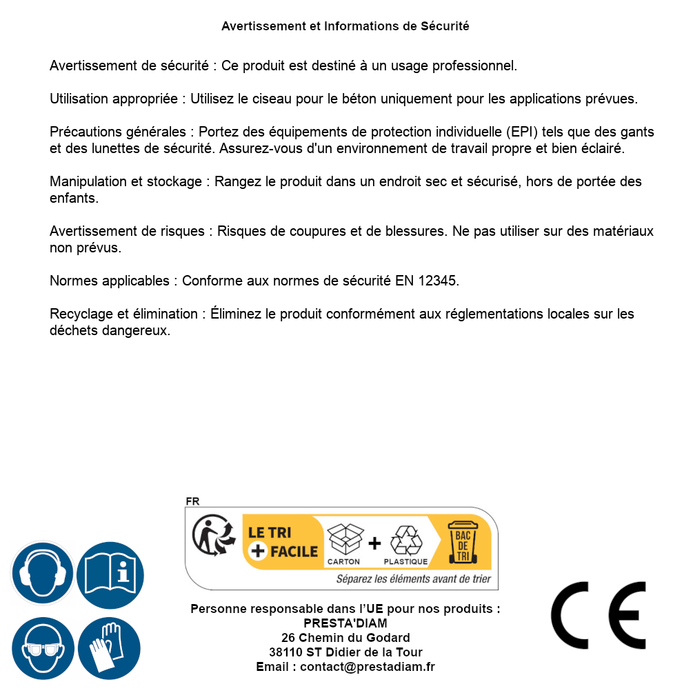 | AVERTISSEMENT et SECURITE | Avertissement de sécurité : Ce produit est destiné à un usage professionnel.Utilisation appropriée : Utilisez le ciseau pour le béton uniquement pour les applications prévues.Précautions générales : Portez des équipements de protection individuelle (EPI) tels que des gants et des lunettes de sécurité. Assurez-vous d'un environnement de travail propre et bien éclairé.Manipulation et stockage : Rangez le produit dans un endroit sec et sécurisé, hors de portée des enfants.Avertissement de risques : Risques de coupures et de blessures. Ne pas utiliser sur des matériaux non prévus.Normes applicables : Conforme aux normes de sécurité EN 12345.Recyclage et élimination : Éliminez le produit conformément aux réglementations locales sur les déchets dangereux. Identification de la personne responsable dans l’UE : Nom : PRESTA'DIAM. Adresse : 26 Chemin du Godard, 38110 ST Didier de la Tour (France). Email : contact@prestadiam.fr. |