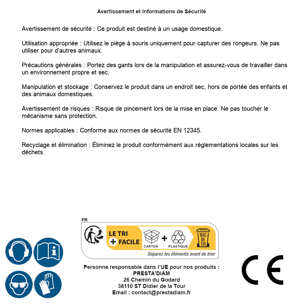 | AVERTISSEMENT et SECURITE | Avertissement de sécurité : Ce produit est destiné à un usage domestique.Utilisation appropriée : Utilisez le piège à souris uniquement pour capturer des rongeurs. Ne pas utiliser pour d'autres animaux.Précautions générales : Portez des gants lors de la manipulation et assurez-vous de travailler dans un environnement propre et sec.Manipulation et stockage : Conservez le produit dans un endroit sec, hors de portée des enfants et des animaux domestiques.Avertissement de risques : Risque de pincement lors de la mise en place. Ne pas toucher le mécanisme sans protection.Normes applicables : Conforme aux normes de sécurité EN 12345.Recyclage et élimination : Éliminez le produit conformément aux réglementations locales sur les déchets. Identification de la personne responsable dans l’UE : Nom : PRESTA'DIAM. Adresse : 26 Chemin du Godard, 38110 ST Didier de la Tour (France). Email : contact@prestadiam.fr. |