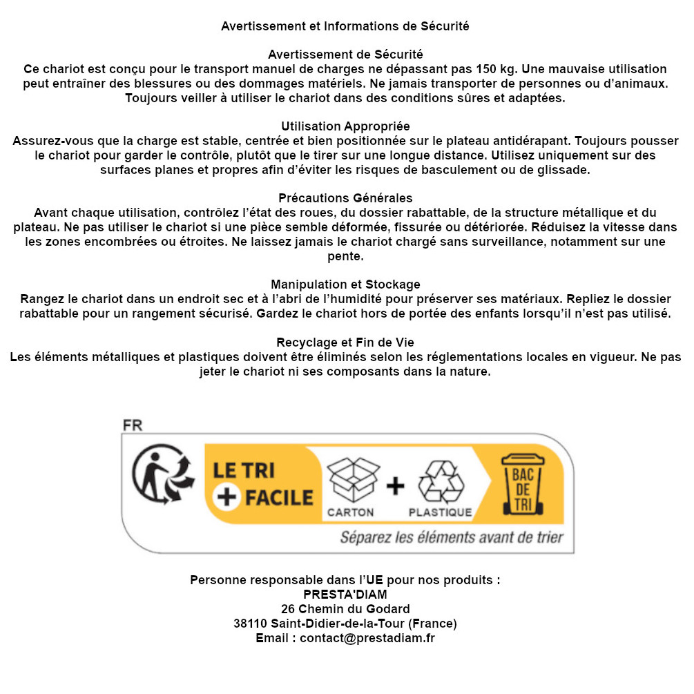 | AVERTISSEMENT et SECURITE | Avertissement de sécurité : Produit destiné à un usage domestique. Utilisation appropriée : Utiliser le chariot pour le transport de charges ne dépassant pas 150 kg. Précautions générales : Porter des gants et des chaussures de sécurité lors de l'utilisation. Travailler dans un environnement dégagé. Manipulation et stockage : Ranger le chariot dans un endroit sec et sécurisé, à l'abri des intempéries. Avertissement de risques : Risque de basculement si la charge est mal répartie. Ne pas dépasser la capacité maximale. Normes applicables : Conforme à la norme EN 131. Recyclage et élimination : Éliminer conformément aux réglementations locales sur les déchets métalliques. Identification de la personne responsable dans l’UE : Nom : PRESTA'DIAM. Adresse : 26 Chemin du Godard, 38110 ST Didier de la Tour (France). Email : contact@prestadiam.fr. |