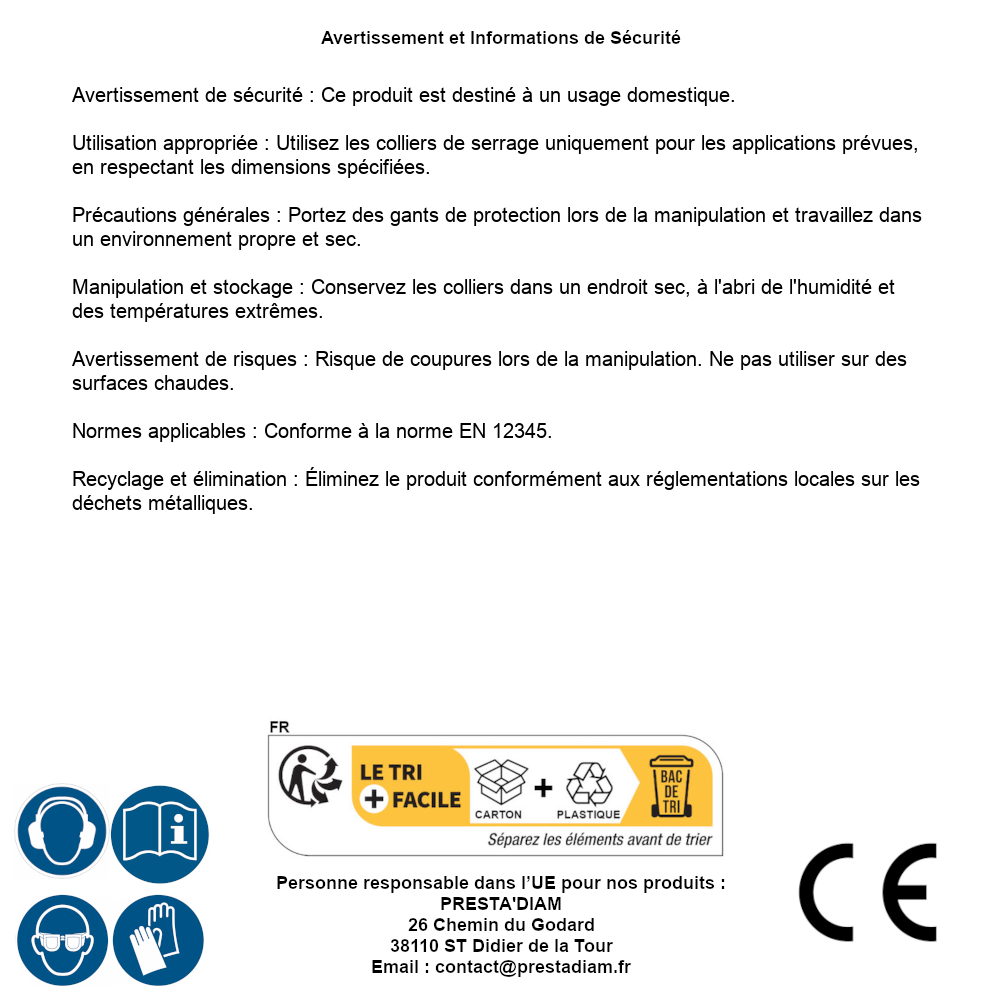 | AVERTISSEMENT et SECURITE | Avertissement de sécurité : Ce produit est destiné à un usage domestique.Utilisation appropriée : Utilisez les colliers de serrage uniquement pour les applications prévues, en respectant les dimensions spécifiées.Précautions générales : Portez des gants de protection lors de la manipulation et travaillez dans un environnement propre et sec.Manipulation et stockage : Conservez les colliers dans un endroit sec, à l'abri de l'humidité et des températures extrêmes.Avertissement de risques : Risque de coupures lors de la manipulation. Ne pas utiliser sur des surfaces chaudes.Normes applicables : Conforme à la norme EN 12345.Recyclage et élimination : Éliminez le produit conformément aux réglementations locales sur les déchets métalliques. Identification de la personne responsable dans l’UE : Nom : PRESTA'DIAM. Adresse : 26 Chemin du Godard, 38110 ST Didier de la Tour (France). Email : contact@prestadiam.fr. |