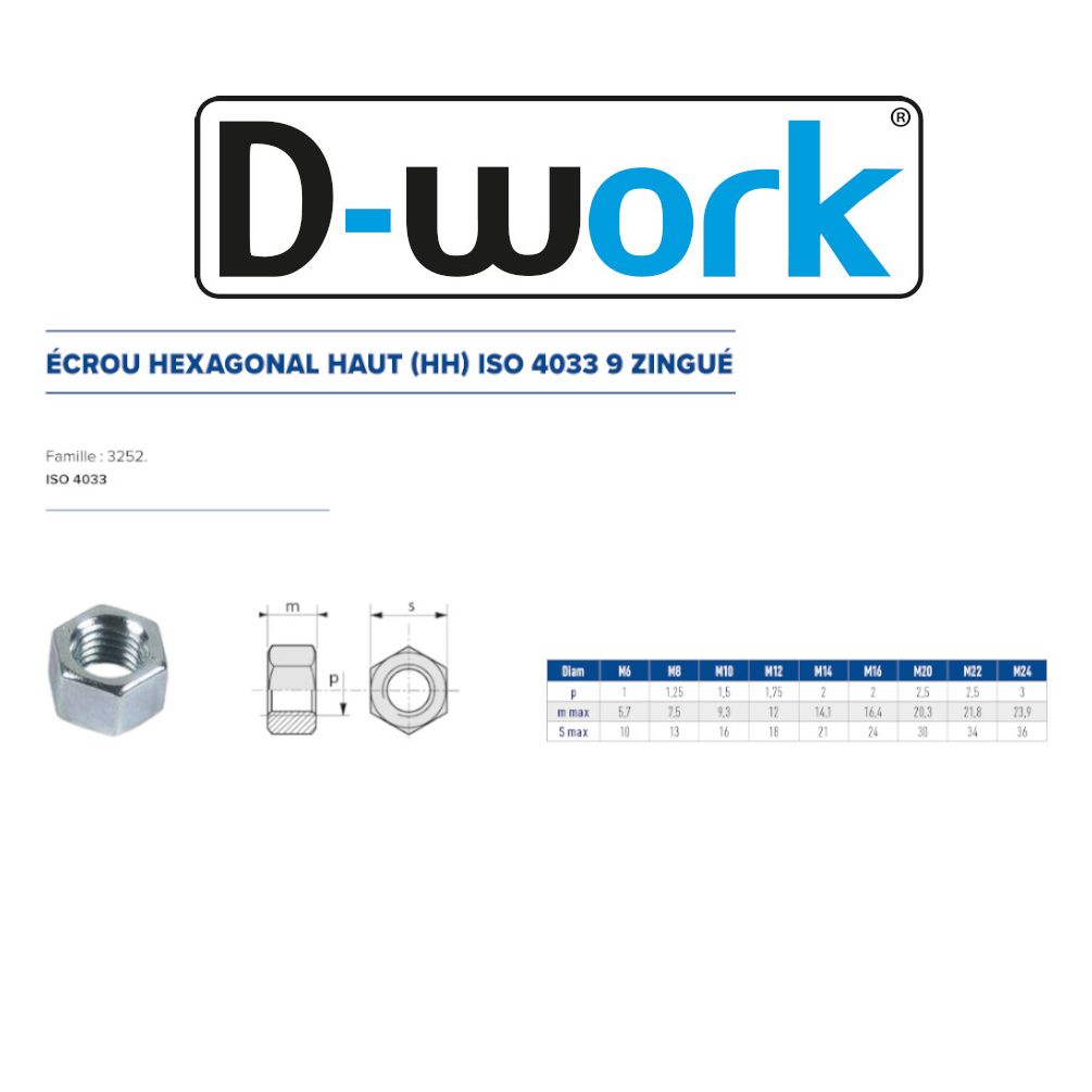 Ref. LEN-3252-6En savoir + sur 1000 Ecrous Hexagonaux Haut M6 mm - 4033 - 9 - Zingué blanc - D-Work