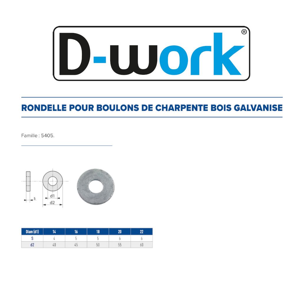 Les 25 Rondelles Charpente D18-20x55x6 mm galvanisées de la marque D-Work sont des éléments essentiels pour assurer une fixation solide et durable dans les travaux de charpente et construction. Conçues pour résister à la corrosion grâce à leur traitement galvanisé, elles garantissent une longue durée de vie même en milieu extérieur.Caractéristiques principales