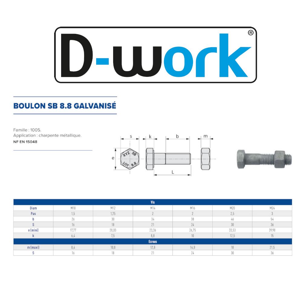 25 Boulons Charpente Métallique SB F/Partiel 16 x 100 mm - ISO 4014-4032 EN 15048 - 8.8 - Galvanisé à chaud - D-Work
