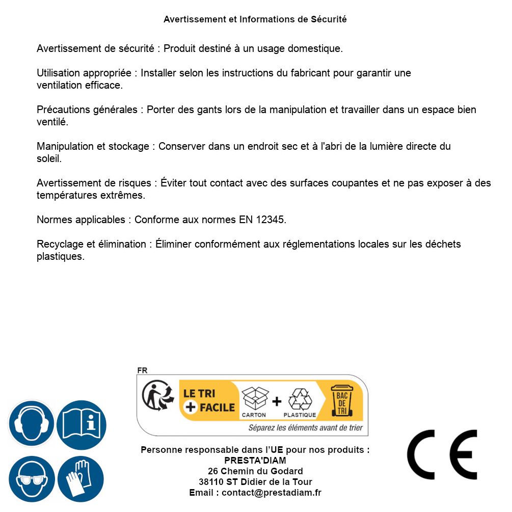 | AVERTISSEMENT et SECURITE | Avertissement de sécurité : Produit destiné à un usage domestique. Utilisation appropriée : Installer selon les instructions du fabricant pour garantir une ventilation efficace. Précautions générales : Porter des gants lors de la manipulation et travailler dans un espace bien ventilé. Manipulation et stockage : Conserver dans un endroit sec et à l'abri de la lumière directe du soleil. Avertissement de risques : Éviter tout contact avec des surfaces coupantes et ne pas exposer à des températures extrêmes. Normes applicables : Conforme aux normes EN 12345. Recyclage et élimination : Éliminer conformément aux réglementations locales sur les déchets plastiques. Identification de la personne responsable dans l’UE : Nom : PRESTA'DIAM. Adresse : 26 Chemin du Godard, 38110 ST Didier de la Tour (France). Email : contact@prestadiam.fr. |